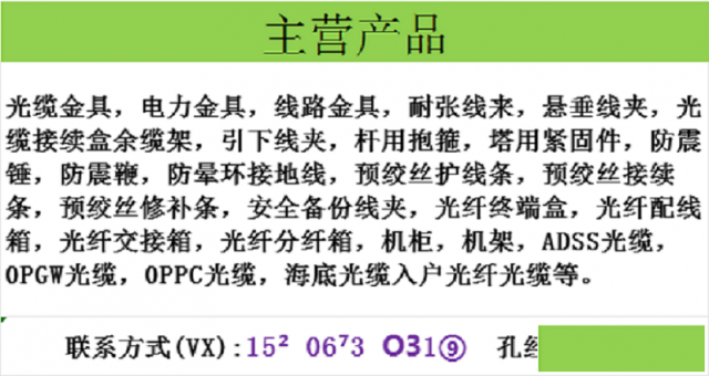 ADSS/OPGW光缆,光缆金具,电力金具,线路金具,耐张线夹,悬垂线夹,光缆接续盒,余缆架,引下线夹,杆用抱箍,塔用紧固件,防震锤,防震鞭,防晕环,接地线,预绞丝护线条,预绞丝接续条,预绞丝修补条,安全备份线夹,光纤终端盒,光纤配线箱,光纤交接箱,光纤分纤箱,机柜,机架,ADSS光缆,OPGW光缆,OPPC光缆,海底光缆,室内光缆光纤等。
