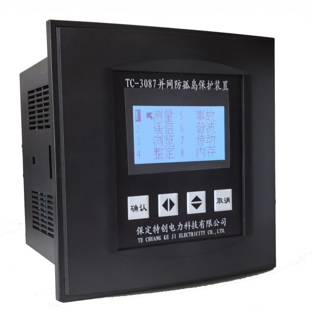 光伏防孤岛保护装置TC-3087适用于清洁电源或小电源并网供电系统,与其公众电网配电系统一起并网供电。由于并网系统地外部原因或自然原因,很有可能造成本地电源系统孤岛运行,这对于现场的发电设备和系统电网危害都很大,一般逆变器和风电发电系统都自带防孤岛的功能,外部并网点也可安装防孤岛的保护装置,在发生孤岛现象时,作为后备保护可以快速切出分布式孤岛电源,由此本装置可以完全满足此功能。