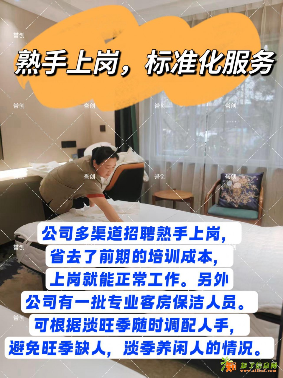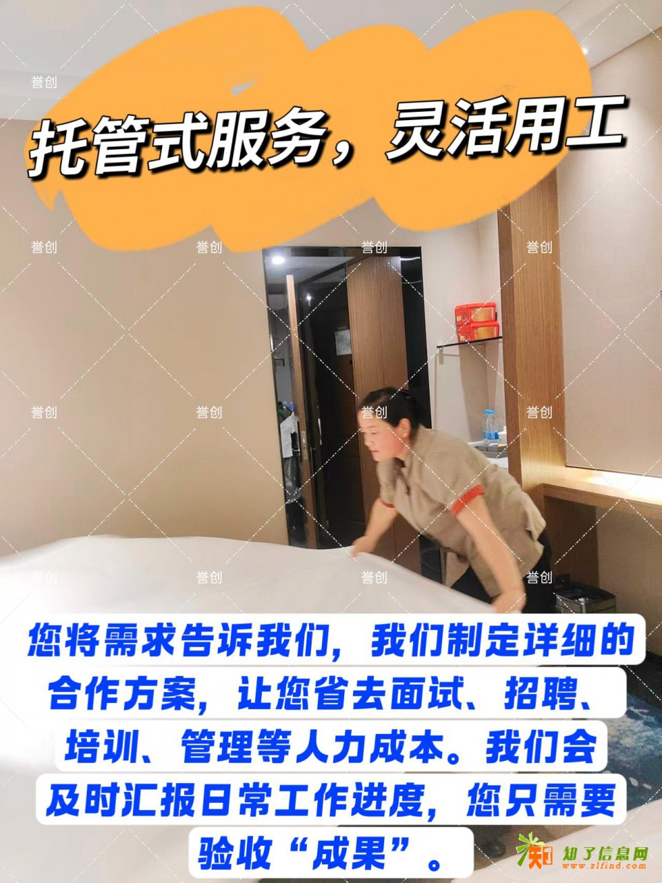 誉创劳务咨询(北京)有限公司 专注承接宾馆酒店保洁托管、民宿保洁托管、公寓保洁托管、企业单位内部接待托管服务。公司一贯遵循“服务第一,品质第一”的服务精神,坚持高定位、高质量、高效率的三高服务标准。