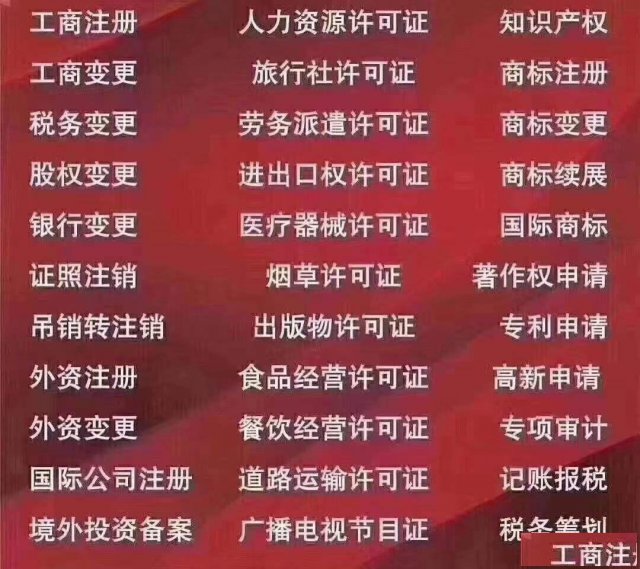 3、公司变更:执照变更,税务变更,股权变更,法人变更,增资减资,经营范围变更,经营期限变更,注册地址变更。