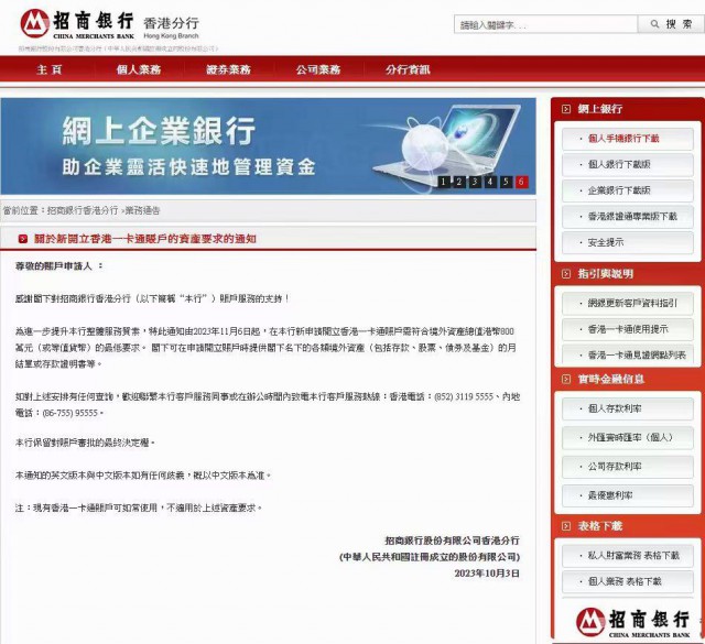2023年11月6日起,香港招商银行个人申请开户门槛提高!