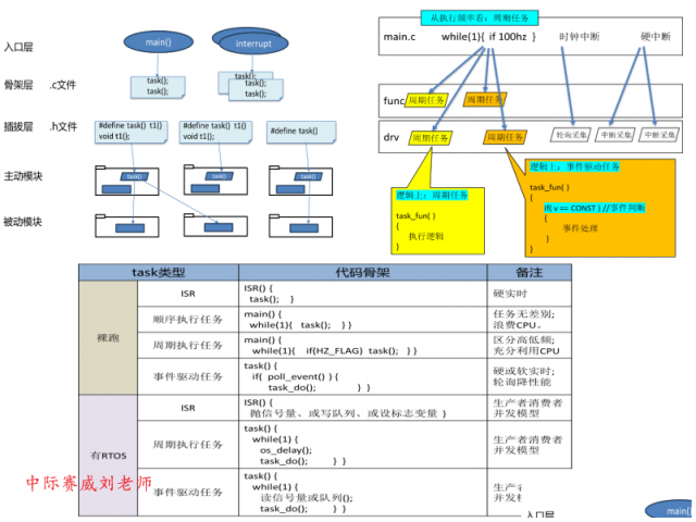二、实际岗位——架构设计的实际步骤。1纵观各家采用什么方法:结构化设计、用例驱动方法、DARTS方法、Layered Multitask方法、方法适用于嵌入式领域的程度。2架构设计实际步骤的小案例实练:某软件的架构设计、给出Loop+ISR架构设计示范、给出RTOS下多任务架构示范。