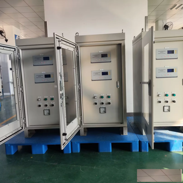 结构组成:主要由逆变式恒电位仪、可控硅式恒电位仪、可控硅式恒电位仪的降压变压器、输入输出接线端子和柜体组成。柜体分为三层,上层固定逆变式恒电位仪,中层固定可控硅式恒电位仪,下层固定输入输出接线端子和可控硅恒电位仪的降压变压器。