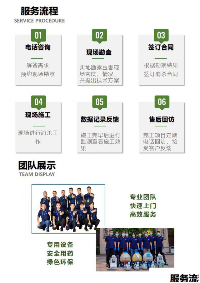 公司拥有一批专业的服务团队,专业的工具,以及虫害综合管理方案,一直以来,公司秉承着“除害造福客户,服务赢得市场,实惠温暖人心”的宗旨,为大量的客户提供了专业、优质的服务,赢得了同行业以及新老客户的支持与赞扬。公司将继续努力,孜孜不倦地为客户服务,为社会出力,欢迎新老客户前来洽谈咨询!