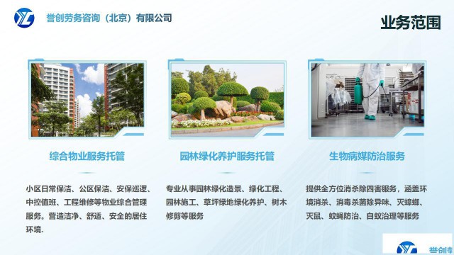 综合管理服务:涵盖安保中控人员外包服务,保障场所安全;专业工程维修团队负责水电、设备等维护工作;园林绿化养护服务为园区、写字楼等打造美观舒适的绿化环境。