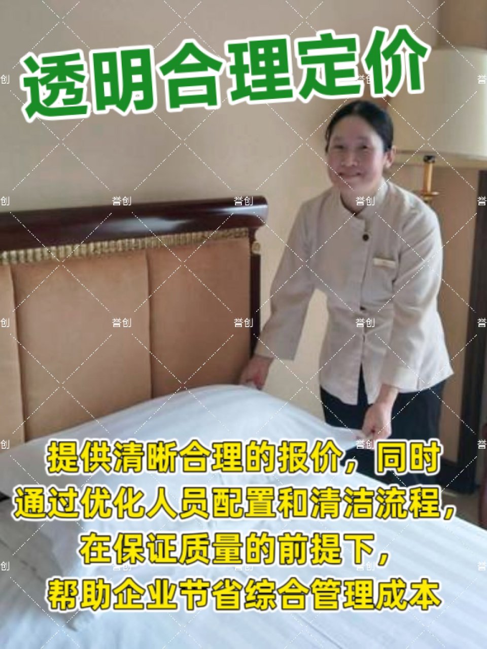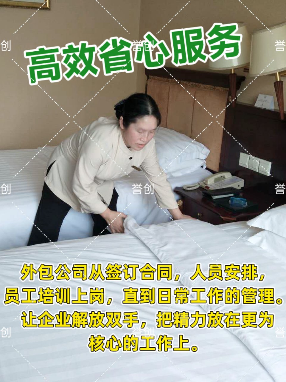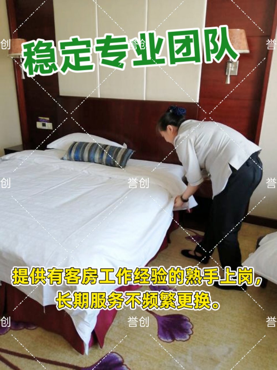 誉创劳务咨询(北京)有限公司 专注承接宾馆酒店保洁托管、民宿保洁托管、公寓保洁托管、企业单位内部接待托管服务。公司一贯遵循“服务第一,品质第一”的服务精神,坚持高定位、高质量、高效率的三高服务标准。