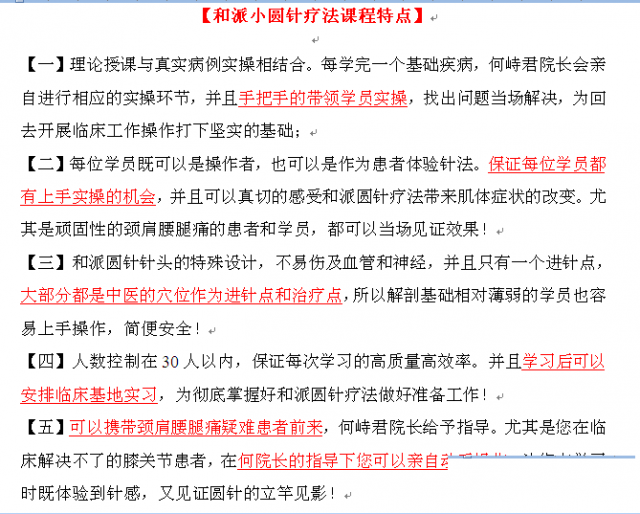 常年举办专利和派小圆针治疗颈腰椎病、膝关节及疑难杂症特色技术临床速成班,我们的教学方法是重点强调临床诊断与治疗,打破以理论为主的教学模式,老师给学员讲解治疗思路、设计治疗方案。学员与老师共同动手治疗,手把手教学,当场指导学员问题所在,讨论、分析、答疑,举一反三使学员彻底学到小圆针治疗颈腰四肢关节病的精髓。