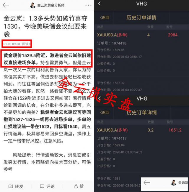 而在昨日的操作中,早间金云岚依旧是在早评中给出1529多单进场提示,下午实仓指导中担心早间有人1529多单没有跟上,再次提示在1541进场多单,晚间多单于1550一线金云岚提示落袋为安。