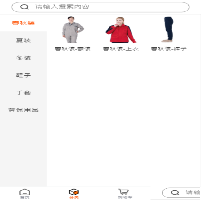 3.样品展示:爱敬业者分类界面为用户提供各类工作服样品展示,其中包含季节装,各类用品提供选择。。