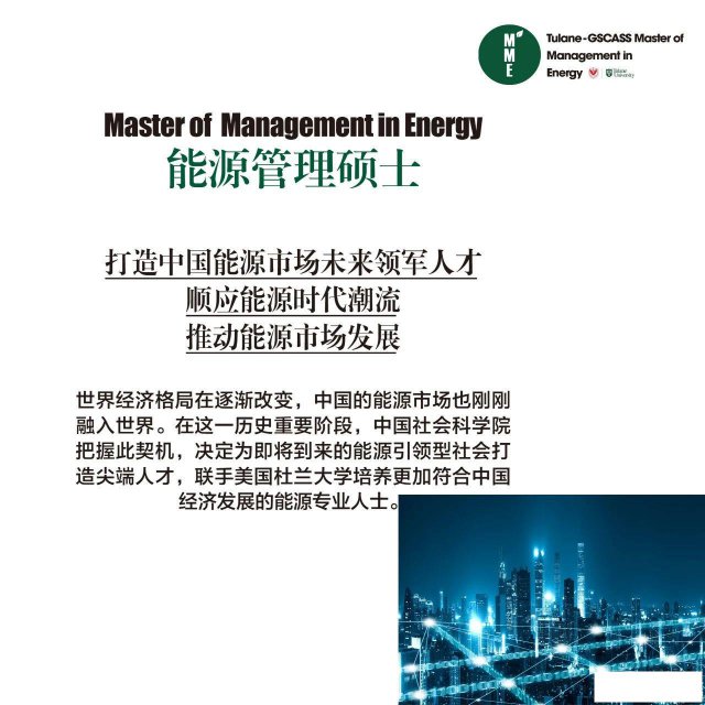 经教育部批准,2018年起中国社会科学院研究生院与美国杜兰大学(Tulane University)合作举办“能源管理硕士” (Tulane-GSCASS Master of Management in Energy,简称MME)项目,每期招生30人,学生在职学习,学制为18个月。学生毕业可获得美国杜兰大学颁发的能源管理硕士(Master of Management in Energy)学位证书以及教育部留学服务中心国(境)外学历学位认证书。随着能源体制机制革命的深入推进,能源及相关的市场化交易服务需求越来越大。2019年,全国市场化电力交易规模已超过2万亿 kWh。经营性行业发用电计划已经全面放开,电力中长期交易市场、现货市场、辅助服务市场建设在加快推进,预期未来市场化电力交易规模还将进一步扩张;基于市场化电力交易的增值服务有待探索与开拓。可用于考公务员、晋升职称、继续读博、享受积分落户等!!!