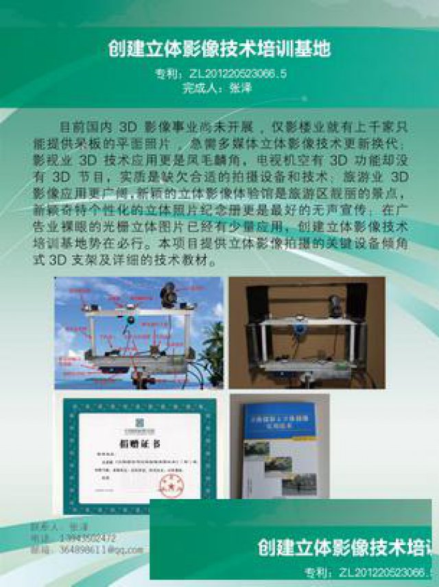 立体影像应用范围非常广阔,可以应用于影楼业,旅游业,影视业和广告业,具有极深远的市场前景。21世纪的影楼是用双相机拍摄,拍摄的是立体图像或者多媒体的立体视频,完全颠覆旧影楼的拍摄模式。立体影像体验馆是旧影楼最佳的更新换代路径。层次分明立体感强烈的光栅立体婚纱照必然会代替老式呆板的平面图片。多媒体的立体视频MV更是开创立体影像的新时代。推广立体影像(立体图像和立体视频)从3D立体影像体验馆开始。此项目2019年荣获上海第三届国际发明创新展览会银奖。
