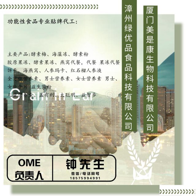 漳州绿优品食品科技术有限公司是一家集研发、生产、销售为一体的高科技产业集团,销售网络延伸全国。公司主营30ml及50ml口服饮料:胶原蛋白饮料、抗糖化饮料、蓝莓果汁饮料、蛹虫草饮料、姜黄素饮料、酵素饮、植物饮料、果蔬饮料等;专业提供食品生产许可内各类别女性饮料的OEM&ODM代加工业务!
