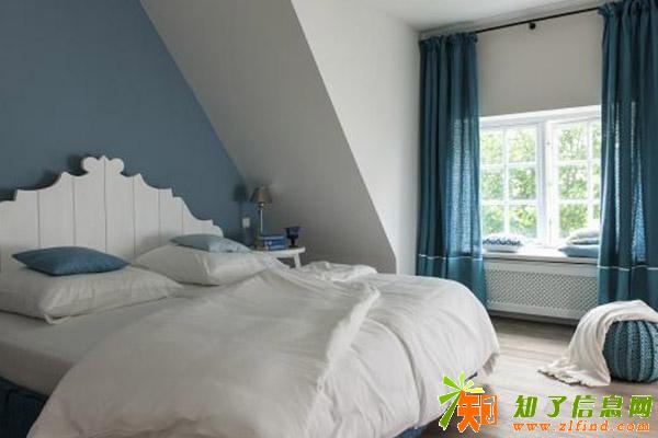 浅蓝色墙壁+浅蓝色窗帘+白色床单