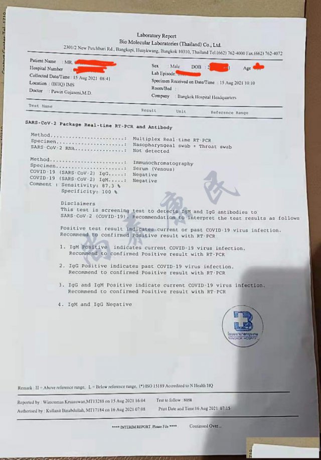 1、驻泰使领馆认可的检测机构(如曼谷医院实验室:BIO Molecular Laboratories (Thailand) Co., Ltd.)出具肺部CT或X光结果的诊断证明(注明肺部无异常或新冠已治愈)、2次核酸检测(分别注明采样时间,两次检测至少间隔24小时,且均为阴性)及1次血清抗体(IgM须为阴性)报告。