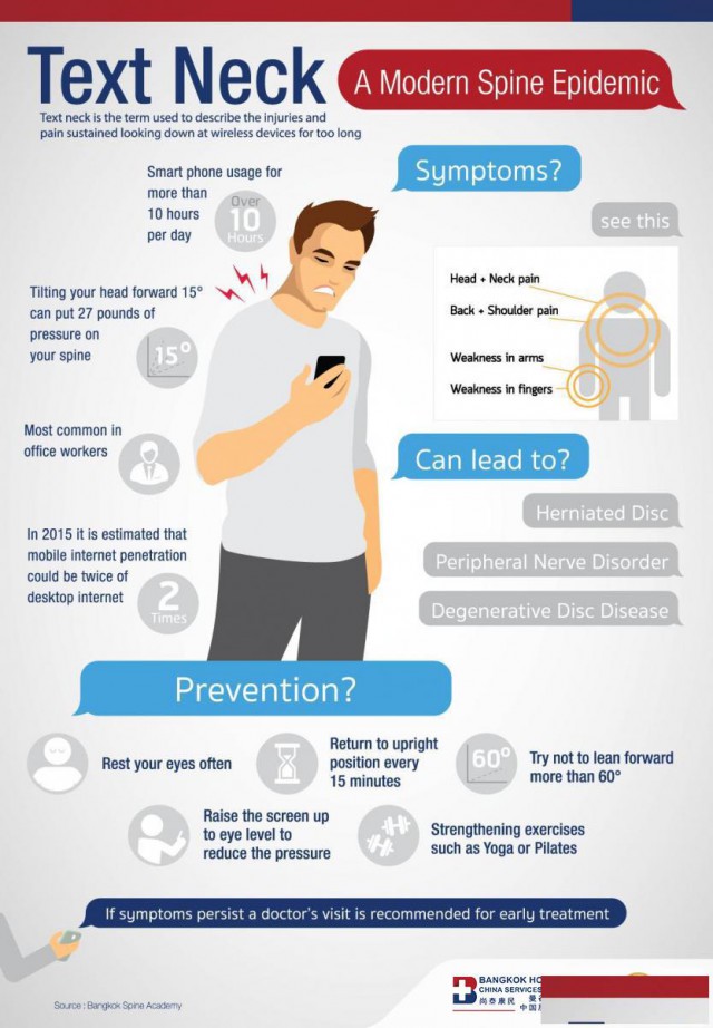 尚泰康民(曼谷医院服务中心)了解到,“手机颈”“短信脖”已经成为新一代的全球性疾病,影响颈椎健康,还会导致上肢疼痛、麻木,甚至出现不同程度的活动限制以及瘫痪状态。生活中除了调整生活习惯预防手机颈外,还应该关注自身状态,如果持续出现颈部疼痛等症状,应及时就医,可联系尚泰康民(曼谷医院服务中心)预约治疗。