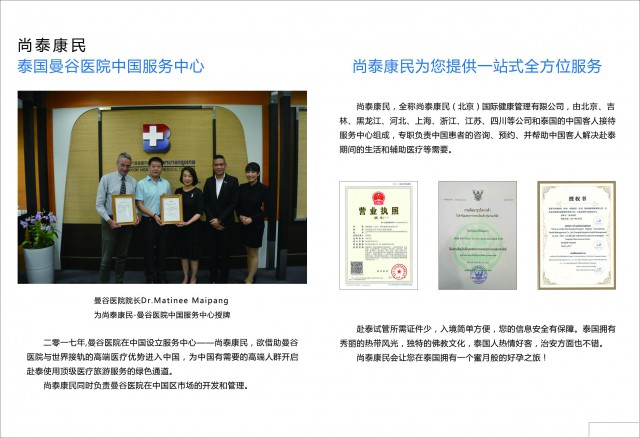 曼谷医院为了更好地服务于中国患者,2017年,曼谷医院在中国设立服务中心——尚泰康民,欲借助曼谷医院与世界接轨的高端医疗优势进入中国,为中国有需要的客人开启赴泰医疗旅游绿色通道。尚泰康民专职负责中国患者的咨询、预约、医疗翻译、医疗签证办理、并帮助中国客人解决赴泰期间的生活和辅助医疗等需要,同时负责曼谷医院在中国区市场的开发和管理。