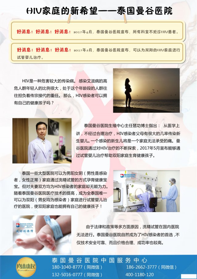 曼谷医院通过对HIV治疗的不断探索,于2017年初正式对外宣布,曼谷医院所有科室不拒诊HIV患者,且能够通过IVF治疗帮助双阳家庭生育健康孩子。