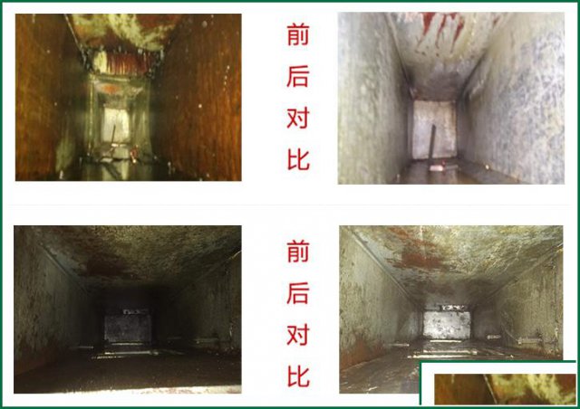 长期使用的排烟罩,风机,油烟净化器,烟道不经常清洗,会有很多油渍残留在烟机上和烟道表面,时间久了会形成油垢,简单清洗是处理不掉的,这样会影响油烟机、烟道的使用,使烟流不易排除。本公司采用高压射流加强力化油剂,对烟道进行除油处理后,再做保养,使油烟气流明显好转,并形成保护膜使油渍不易残留在表面。人工铲除油垢+超强金属专用清洁剂,对油烟机表面油污清除效果显著,无毒、无味、不伤金属和瓷面。