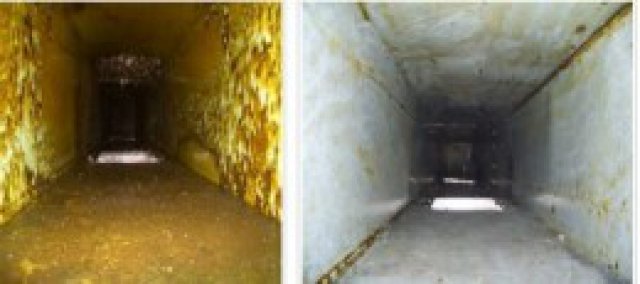 1、与烟罩同步管道基本上可以见到原有的内壁铁皮,无残留块状干涸油污。