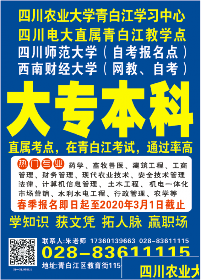 四川农业大学青白江分校是您进修的最佳学校,利用业余时间学习知识拿文凭,学习技能找工作!