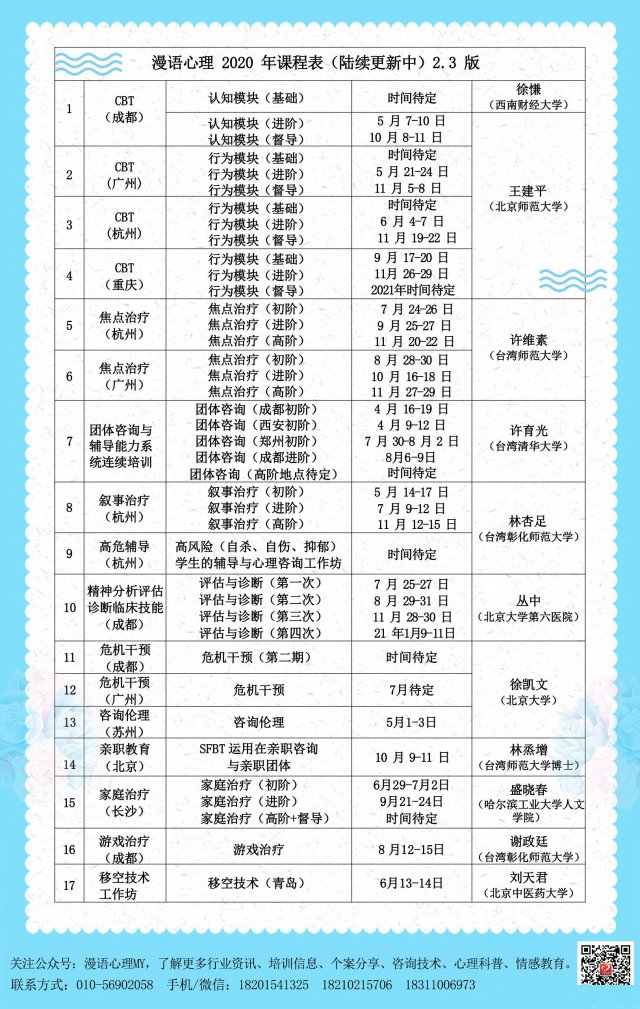 课程延伸,在线督导,案例解析,精进实操:添加延续的进阶在线督导课程,精进团体实操能力。期待参加系统培训的学员,能拥有精熟运用团体咨询与辅导的专业能力,大幅提升心理健康教育工作者之专业水平,贡献于学校与社区等师生家长与来访者。