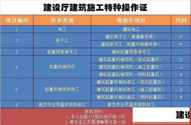建设厅特种操作证类别: