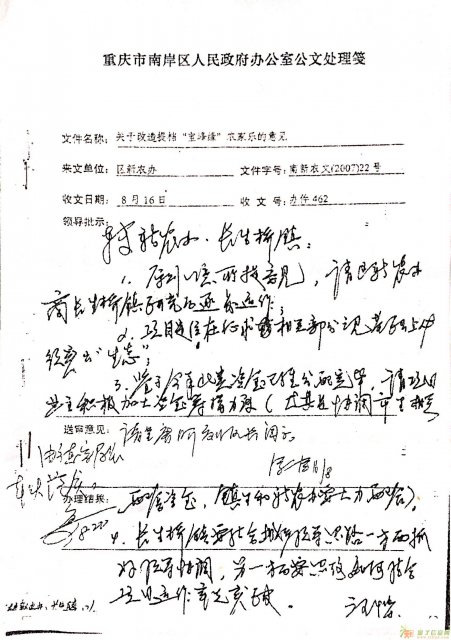 公司为山庄提档升级,扩大规模,时任南岸区人脉政府副区长唐昕针对本项目建设做了专门批示,并立即组织人员对本项目的计划发展及长生桥镇政府的请示内容进行了批示,提档升级符合长生桥镇凉风村新农村示范村的建设要求,并对项目方案提出建议和要求 。