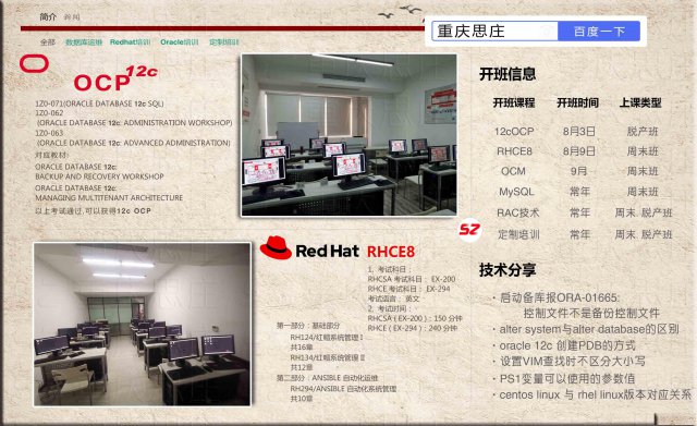 重庆思庄自08年成立开始做IT培训,从Oracle刚引入中国就开始就做Oracle培训,是中国最早做Oracle 数据库培训的专业机构。重庆思庄独树一格的覆盖面极广的课程设计、成熟的教学理念和方法、真实的工作设备环境、大量的项目实战练习、全职的OCM讲师、多年积累的众多企业合作关系,是连接数据库人才与企业的最佳桥梁。