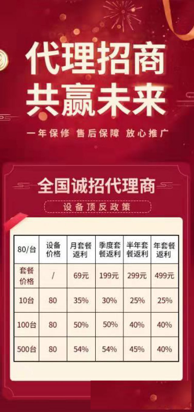 例如设备代理价55元/台,卖出去之后你可以赚取一定的设备盈利,然后加上用户充值返佣如用户充值一个月:69(套餐价,年包,季包等以此类推)*0.54(您的返佣)=37.26,再加上您设备赚10+元,也就是等于您花50多买一台设备卖给用户,少说赚50元左右。