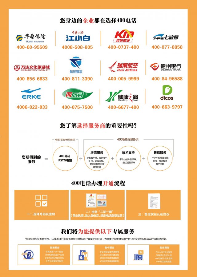 400电话是电信运营商专为企事业单位设计的,无缝对接强大的云呼叫中心系统,所有拨打400电话的来电均被转接至预先绑定的固定电话或手机上进行接听,实现企业对外宣传统一性,规范性。