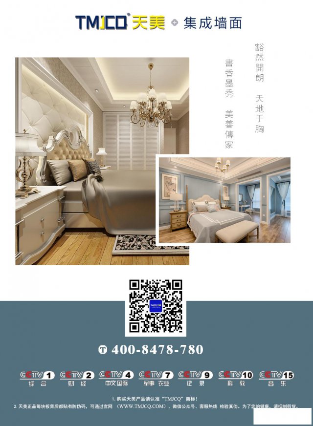 TMJCQ天美集成墙面于2011年进军集成墙面行业,2013年升级换代成第二代竹木纤维集成墙面,是ISO9001质量体系认证企业,基地占地26000平方米,有52条全自动生产线,专注于顶墙集成和全屋整装,几百家专卖店遍布全国。天美集成墙面使用高分子防水防火材料技术,先后荣获“中国优秀绿色环保产品”、“国家绿色建材”、“中国著名品牌”、“诚信品牌”“集成墙面十大品牌”、“消费者最喜爱墙面品牌”等多项荣誉,拥有多项专利。经国家化学建材监督检测中心的权威检测,天美产品防火级别为B1级,达到工程防火级别,环保级别达到E0级,甲醛含量小于0.1mg/L,是目前世界上最严格的环保标准。天美品质享誉世界十多个国家和地区。