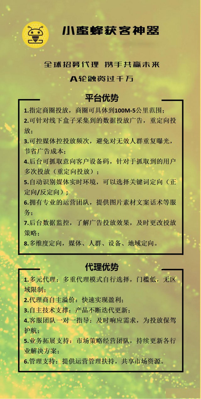 线下采集:指定区域布设小蜜蜂获客系统,设备自动收集区域访客,移动设备识别码,积累海量潜在客户池。