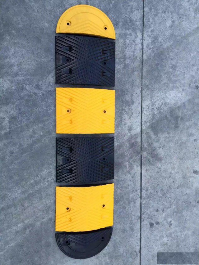 减速带又称减速板、减速拱、缓冲带、减速坡、减速胶、减速垫、减速路拱、橡胶减速板、橡胶路拱、橡胶减速路拱、橡胶减速带、橡胶缓冲带、橡胶减速块、道路减速带、道路橡胶减速带、路拱、橡胶减速垄。特点:专业设计,减速效能显著,且无噪音和不舒适感;高强橡胶坚固实用,耐压持久;根据实际要求,快速灵活组合,易于安装;黑黄相间,无论白天夜晚均有超凡表现,吸引驾车者注意,成功减速;适用面广,新一代的安全产品,管理者的好帮手。材质:由高强度橡胶制成,橡胶减速带减震性、抗压性极好,寿命长,对车磨损少,噪音少,颜色为醒目的黄黑相间,色彩分明,无论在白天或夜晚都具有高度可视性。安装位置:主要用于城市路口,公路道口,收费通道,花园、小区、停车场、车库、加油站等出入口、上下坡等场所的地面上。安装方法:安装比较方便,通常采用标准块状任意组合方式和先进的“内膨胀锚固技术”,用螺丝牢固地将其固定在地面,安装牢固,稳定可靠,车辆撞击时不会松动。