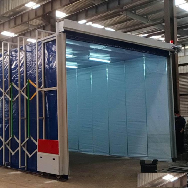 移动伸缩前室由钢架结构和阻燃PVC布组成,通过平行四边形连杆机构或轨道驱动系统实现自动展开与合拢。工作时,前室沿轨道平滑移动至工件上方,形成封闭/半封闭空间进行喷漆;完成后收缩至一侧,节省空间并实现多工序共用场地。其核心系统包括: