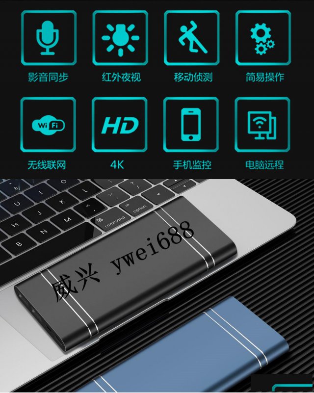 新款Y1移动电源 4K超薄夜视wifi摄像机 ,超强无光夜视8米,手机电脑多平台远程视频观看,新一代海思无线主控,画面流畅不卡顿,150度氧化铝合金机身,手感细腻,黄金比例设计,握感舒适。