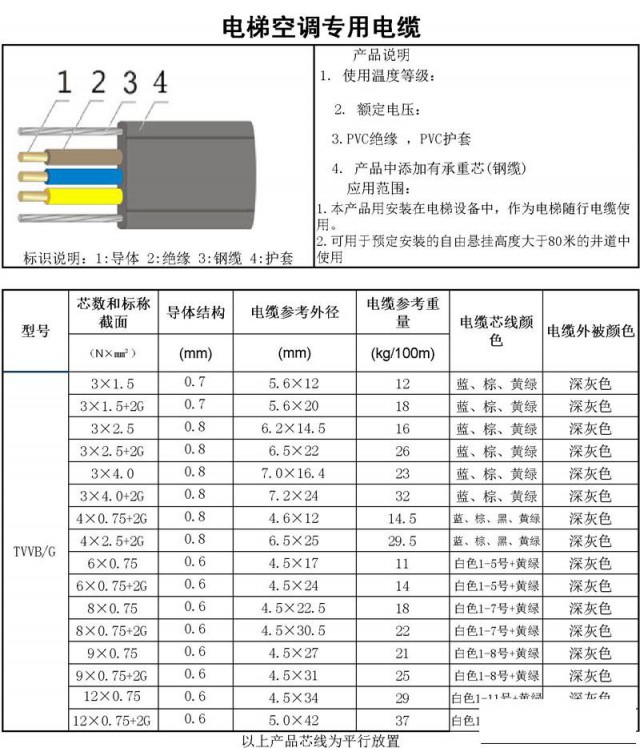 常见型号:如 TVVBG、TVVBYFFB 等。其中 TVVBG 是较为常用的电梯空调专用扁电缆型号,“T” 表示电梯用电缆,“V” 表示聚氯乙烯绝缘,“B” 表示扁型电缆,“G” 表示带钢丝。
