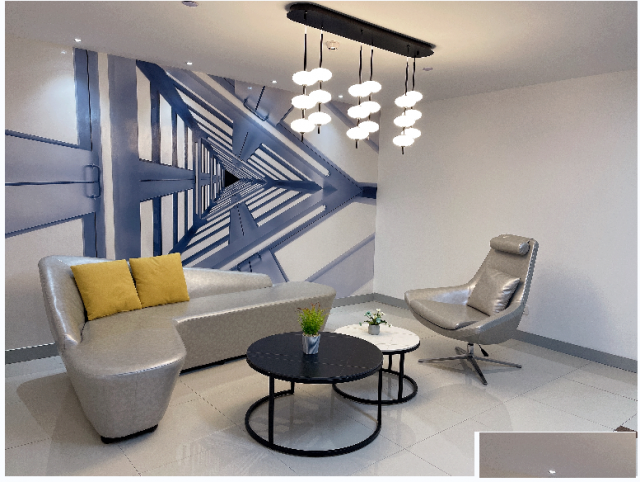 1、配置精装前台、商务会议室、洽谈区;