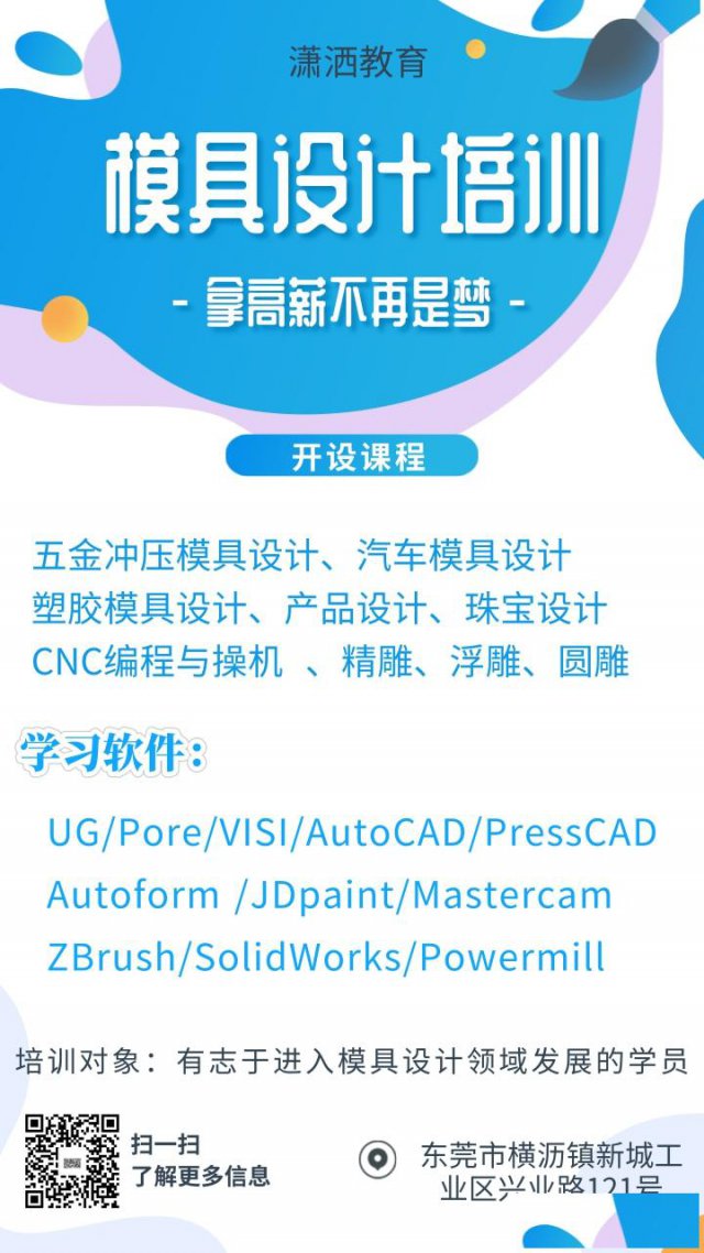 东莞大岭山CNC编程培训机构“潇洒模具”是东莞市横沥镇政府主办的东莞市横沥模具技术培训学院共同打造强大模具培训基地的校企合作单位(简称:潇洒模具), 它于2008年成立,其始,以五金模具设计培训为主,并发展为国内*大的五金模具设计师培训基地,自与横沥模具学院联合办学以来,扩大办学规模,在原有五金模具设计的基础上增加塑胶模具设计、产品设计、数控编程、精雕浮雕等培训课程,形成了满足整个模具与产品加工行业各岗位的学习平台。 集工业产品造型设计、工业模具开发、工业产品设计、二次开发技术、工业产品仿真、工业加工技术、数控模具设计技术的培训。是东莞潇洒模具数控模具科技研究所培训中心。东莞大岭山CNC编程培训机构“潇洒模具”课程介绍:是世界上使用*广、**的一个产品工程解决方案,它为用户的产品设计及加工过程提供了数字化造型和验证手段。 东莞大岭山CNC编程培训机构“潇洒模具”培训项目如下:基础课学习: 机械制图原理、AutoCAD软件学习、UG软件知识、模具理论。学习内容:1. 掌握图纸幅面与图框,理解视图,理解表面粗糙度、公差与配合、形位公差相关规则及应用,三视图及其对应关系、点、面的投影方法及剖视图、断面图表达方法,第一或第三投影视角识图。2. 熟练运用AutoCAD绘制各种零件或装配的工程图并完成尺寸标注。大岭山CNC编程培训机构3. 熟练掌握UG中的模块Sketch(草绘)Part(建模)Drawing(工程图)Assembly(装配)应用:UG模具设计课程:破面(IGES)修补,产品分析拔模处理、全参数化自动分模、手动分模、分模失败处理、模具结构、HB-MOULD外挂、2D排位、常见典型模具结构、整套模具散件图。培训收益:通过理论和实践的有效结合,全面强化练习,全面掌握UG软件的应用并能完成工厂的实际项目,使设计水平和效率得到更大提高;把自己训练成为有理论知识更有实践能力的高水平模具设计师。