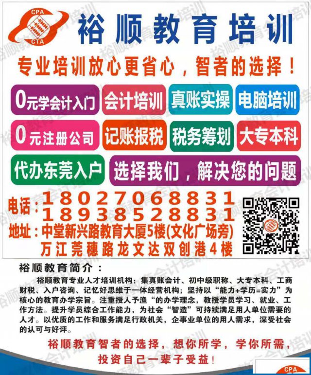 想学会计就来裕顺教育睿信会计,东莞最专业的会计培训机构,学习环境好,学完包分配工作。来裕顺教育申请免费试听吧,绝对不会让你失望!