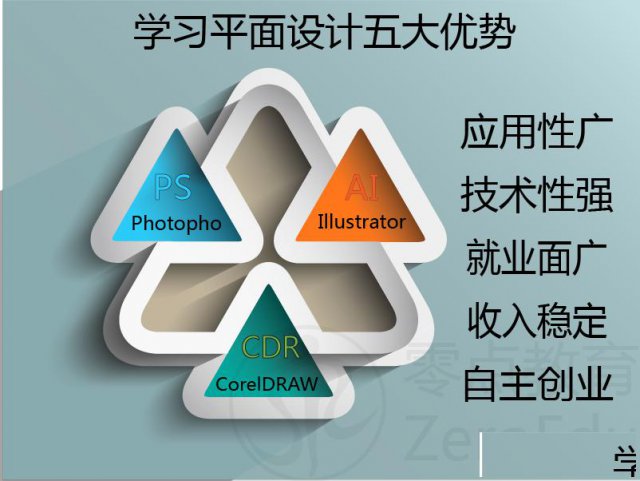 平面设计培训班讲解优秀的界面与基础知识,基本图形的新建,文本及文本的编辑段落文本的编辑,图形的常用命令,条形码输出与打印,设计公司标识,彩页手册,产品包装。