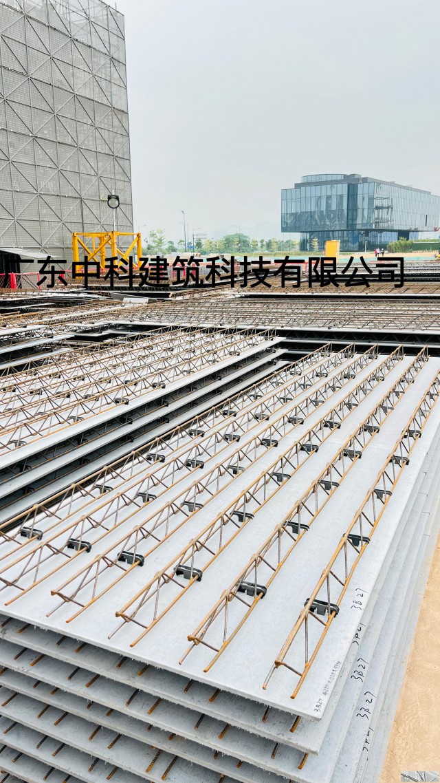 (2)施工作业灵活便捷。相比于钢筋混凝土楼板,组合式钢筋桁架楼承板施工更加便捷,现场钢筋绑扎量减少了 60%~70%,同时由于桁架受力模式合 理,可以提供更大的楼承板刚度,大大减少或无需施工用临时支撑安全。此外,组合式钢筋桁架楼承板在力学性能、 楼板抗裂性能、耐火性能上技术优势也非常明显。