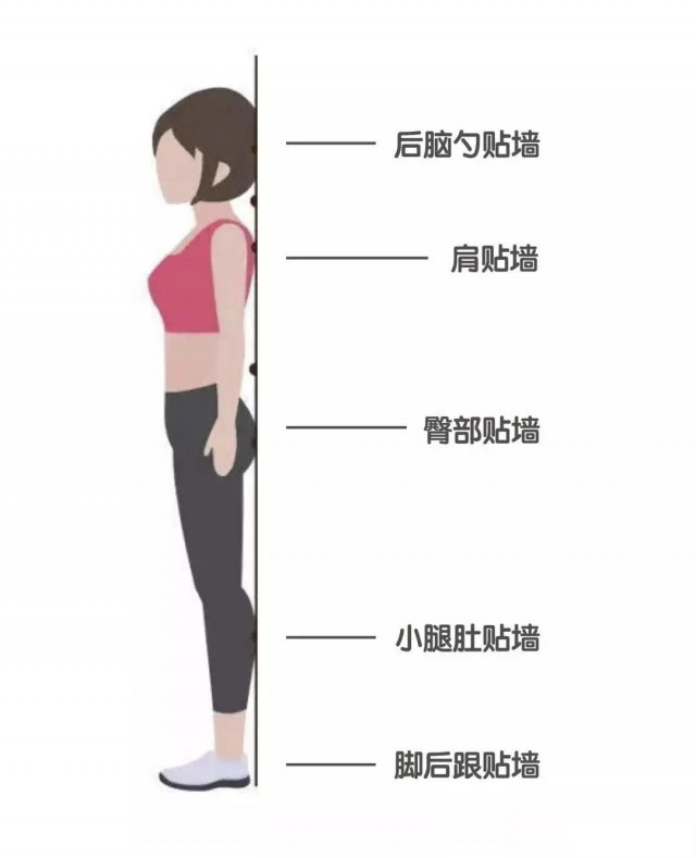 站姿收腹:靠墙站立,双脚略分开与肩同宽,抬头、挺胸、提臀、收腹,头、背、臀部均紧贴墙,双脚离墙约30厘米。吸气时准备,呼气腰贴墙,感觉肚脐贴向脊柱,吸气还原,重复进行。