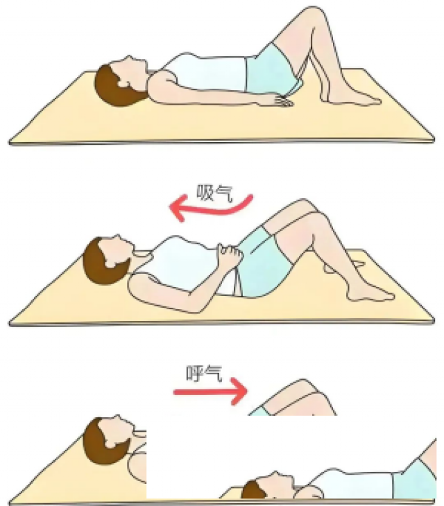 仰卧平躺,双腿弯曲,双脚平放,腹部放松。