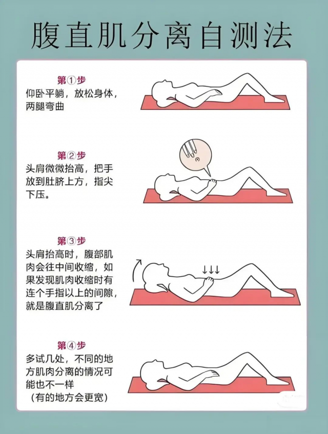 如何判断是否存在腹直肌分离呢?一个简单的自测方法是:平躺床上,双腿弯曲,头肩微抬,手放肚脐上方指尖下压。若腹部肌肉收缩时,有两个手指以上的空隙,就可能存在腹直肌分离。小丽就是用这个方法,发现自己确实存在腹直肌分离的情况。