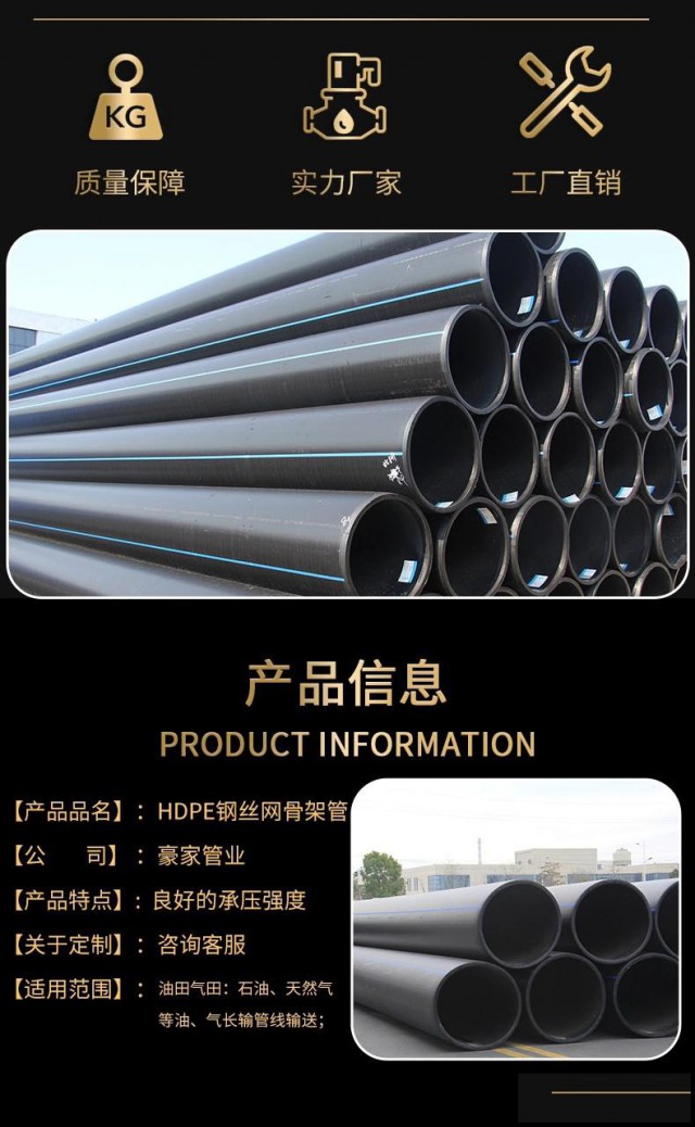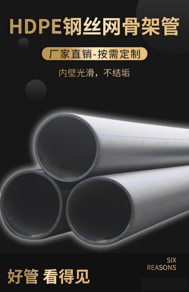pe钢丝网骨架塑料复合管又称为给水用钢丝网增强聚乙烯复合管,是以缠绕成网状的高強度过塑钢丝为增强体,釆用热熔胶粘结固定钢丝网,內外层为双面PE塑料的一种新型低、中、高压复合管材。因为增强体被包覆在连续热塑性塑料中,所以这类复合管材即克服了钢管和塑料管的缺点,具有钢管和塑料管的共同优点,是解决建筑及市政给水管道的一项突破性技术成果,也是解决石油、化工、制药、食品、矿山、燃气等领域对大口径刚性管的急需管道。管道系统釆用电热熔管件连接,利用管件內部发热体将管材外层塑料与管件內层塑料熔融,把它们可靠地连接在一起。