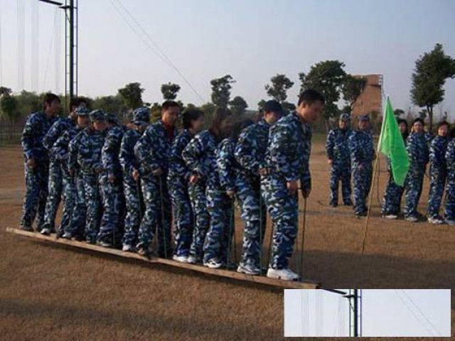 要求:在8米的高空有三块30厘米宽不同长度相隔50-100厘米摇晃不平的木板,队员依次从木板的一头走过和跨过这三块木板,其他队员分组抓住木板垂下的绳子,掌握平衡,让高空的队员顺利通过。