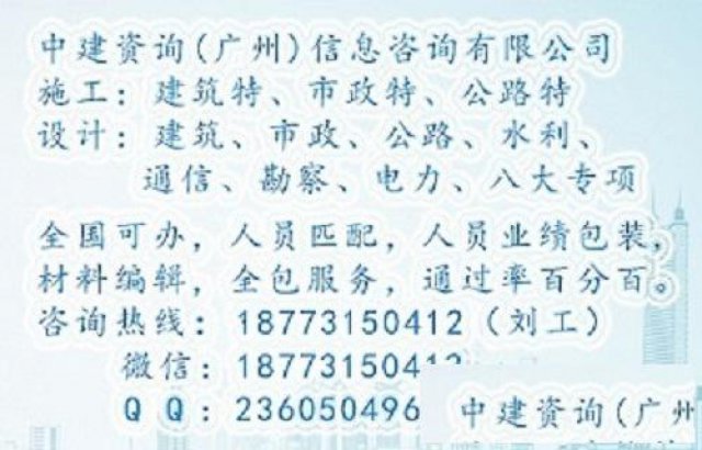 我司专业做资质代申报多年,有众多成功案例可供参考,可提供一整套的人员和人员业绩,专业团队编辑申报材料,专家亲自预审材料,能提供大型设计院的项目业绩,可函查,职称人员充足,包疏通关系,资质通过率100%。欢迎来电咨询了解刘工(电/微):l87-73l5-04l2