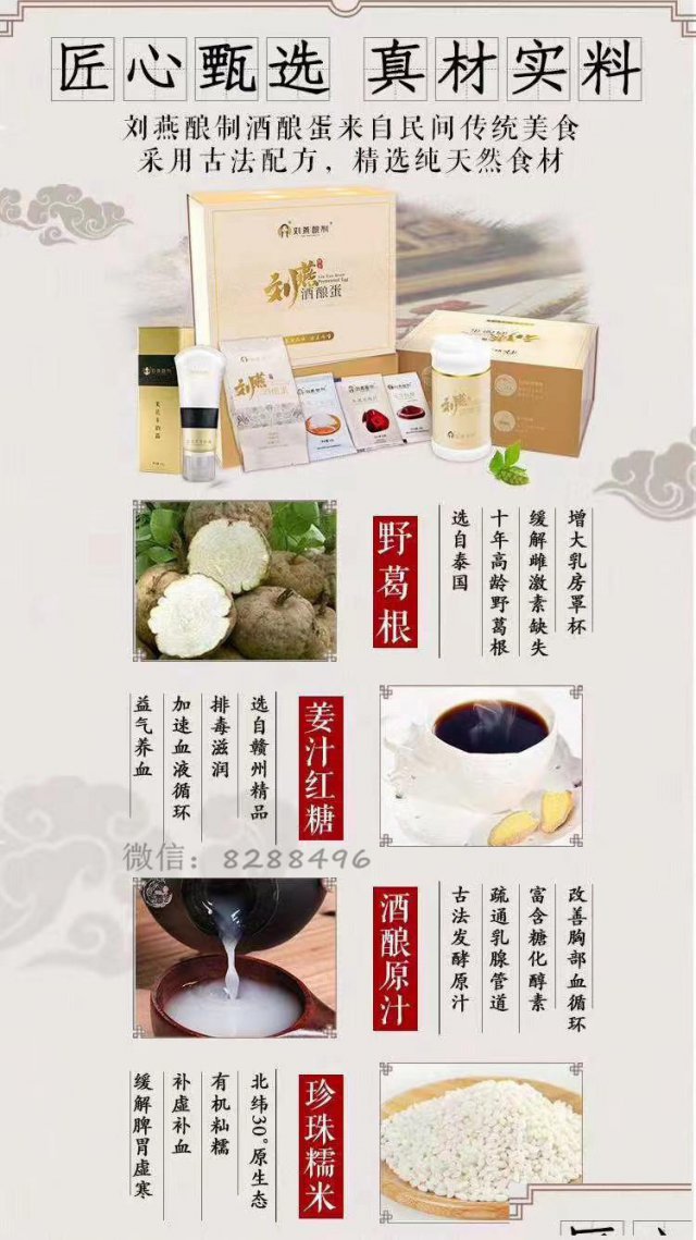 刘燕酿制酒酿蛋,即冲即饮,轻松丰胸,100%纯天然无副作用。做女人,“挺”自信。胸部发育不良不自信,产后乳房下垂松弛,绝经前后乳房干瘪无弹性,皮肤蜡黄气色不佳,内分泌失调痛经现象,这些情况发生在你的身上吗?那么你很幸运,因为我们的酒酿蛋可以帮助你解决种种困扰。