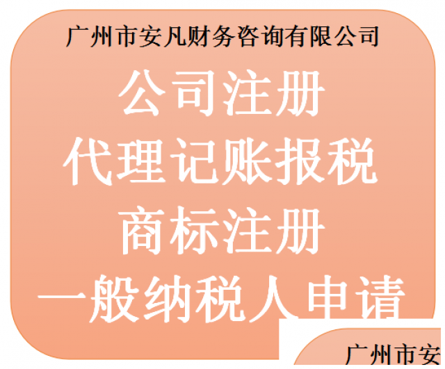 广州市安凡财务咨询有限公司位于历史悠久,交通发达,经济发达,地理位置优越,对外贸易发达的广州市。 具体地址是广东省广州市白云区黄石西路广开源大厦,主要经营:广州公司注册、离岸公司注册、广州注册商标、代理注册商标、一般纳税人申请、代理记账报税等。 我们是一家专业的商务服务公司,本公司实力雄厚,能满足客户多种需求。公司的经营理念是:诚信、守真,服务、迅速,公司尊崇“踏实、拼搏、责任”的企业精神,并以诚信、共赢、开创经营理念,创造良好的企业环境,以全新的管理模式,完善的技术,周到的服务,卓越的品质为生存根本,我们始终坚持用户至上 用心服务于客户,坚持用自己的服务去打动客户。我公司秉承先进的管理理念及优质的服务,必将成长为具有特色品牌的商务服务公司。