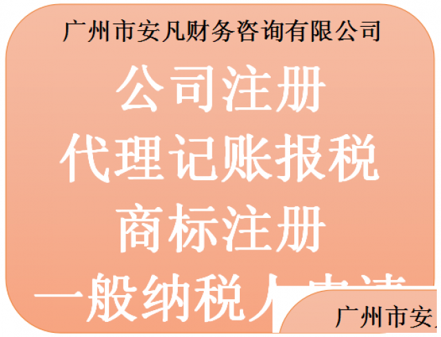 广州市安凡财务咨询有限公司位于历史悠久,交通发达,经济发达,地理位置优越,对外贸易发达的广州市。 具体地址是广东省广州市白云区黄石西路广开源大厦,主要经营:广州公司注册、离岸公司注册、广州注册商标、代理注册商标、一般纳税人申请、代理记账报税等。 我们是一家专业的商务服务公司,本公司实力雄厚,能满足客户多种需求。公司的经营理念是:诚信、守真,服务、迅速,公司尊崇“踏实、拼搏、责任”的企业精神,并以诚信、共赢、开创经营理念,创造良好的企业环境,以全新的管理模式,完善的技术,周到的服务,卓越的品质为生存根本,我们始终坚持用户至上 用心服务于客户,坚持用自己的服务去打动客户。我公司秉承先进的管理理念及优质的服务,必将成长为具有特色品牌的商务服务公司。